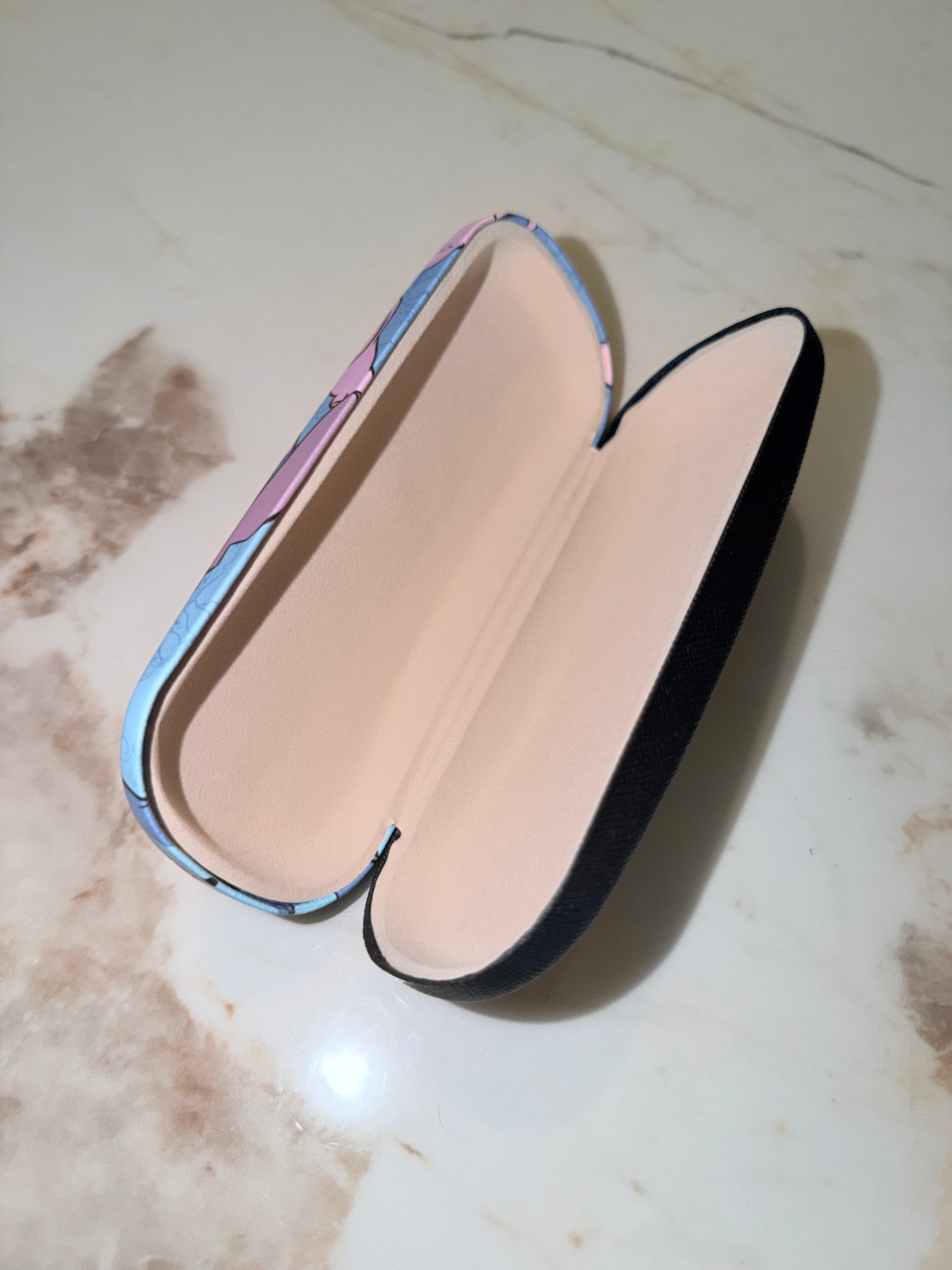 Protégez vos lunettes avec style grâce à cette boîte à lunettes au design vibrant et à l’intérieur velouté. Son extérieur mêle nuances de rose et de bleu pour une touche artistique, tandis que son intérieur beige doux préserve vos montures des rayures et des chocs.