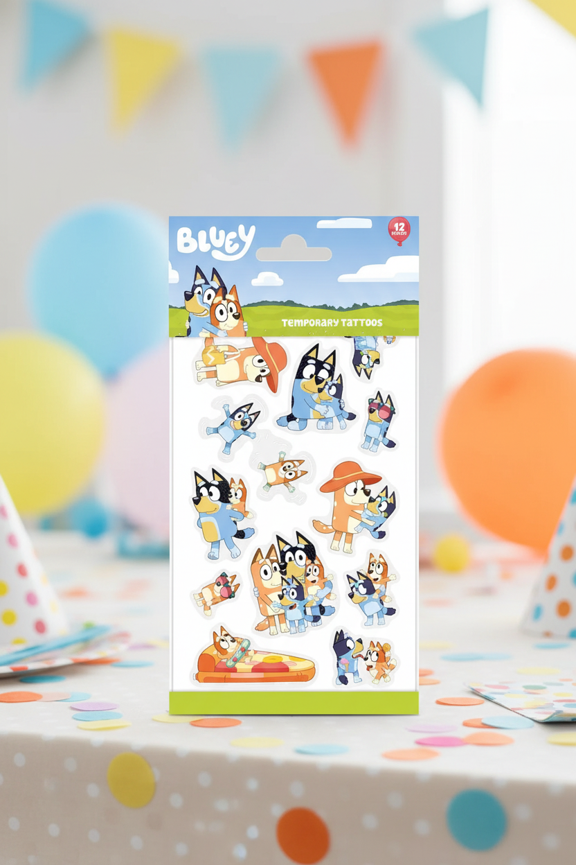 Rejoignez les aventures de Bluey avec ce lot de 12 tatouages éphémères !