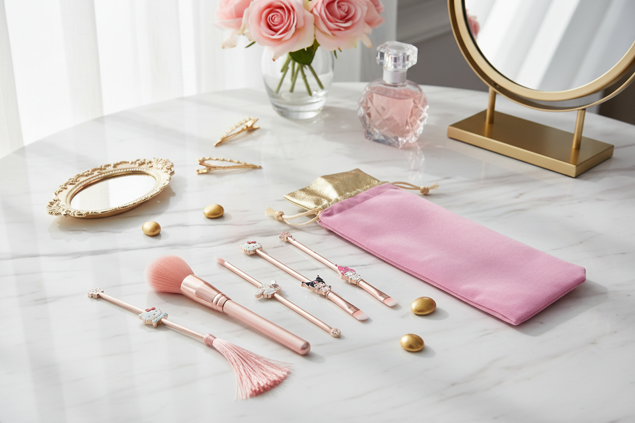 Apportez une touche de mignonnerie et de fantaisie à votre routine beauté avec ce lot de 5 pinceaux Hello Kitty. Avec leurs manches roses décorés de petites têtes adorables, ces pinceaux allient praticité, douceur et style kawaii pour un maquillage toujours réussi.