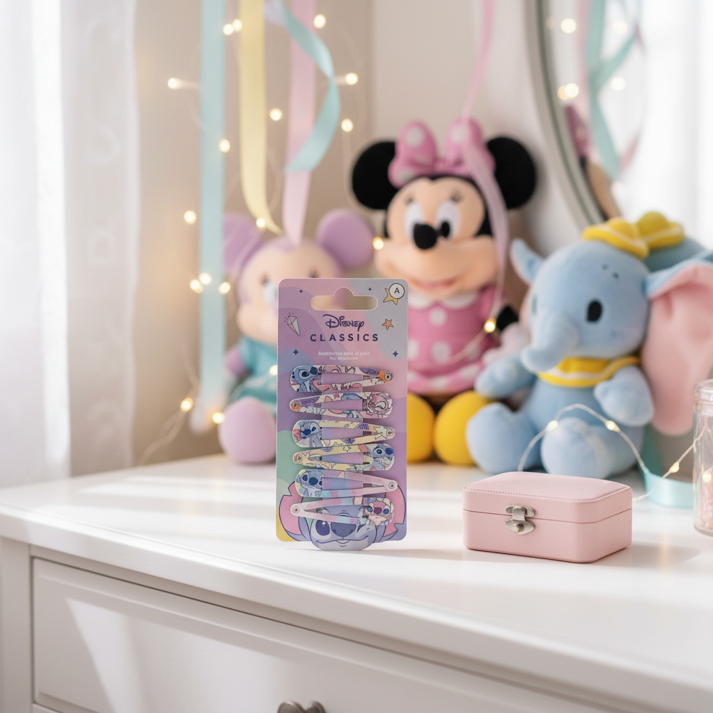 🌺 Un duo trop mignon pour des coiffures pleines de magie ! Le Lot de 6 Barrettes – Stitch & Angel apporte une touche fun, colorée et adorable à toutes les coiffures. Parfaites pour les fans de l’univers Lilo & Stitch, ces barrettes sont idéales pour maintenir les mèches ou accessoiriser les looks du quotidien.