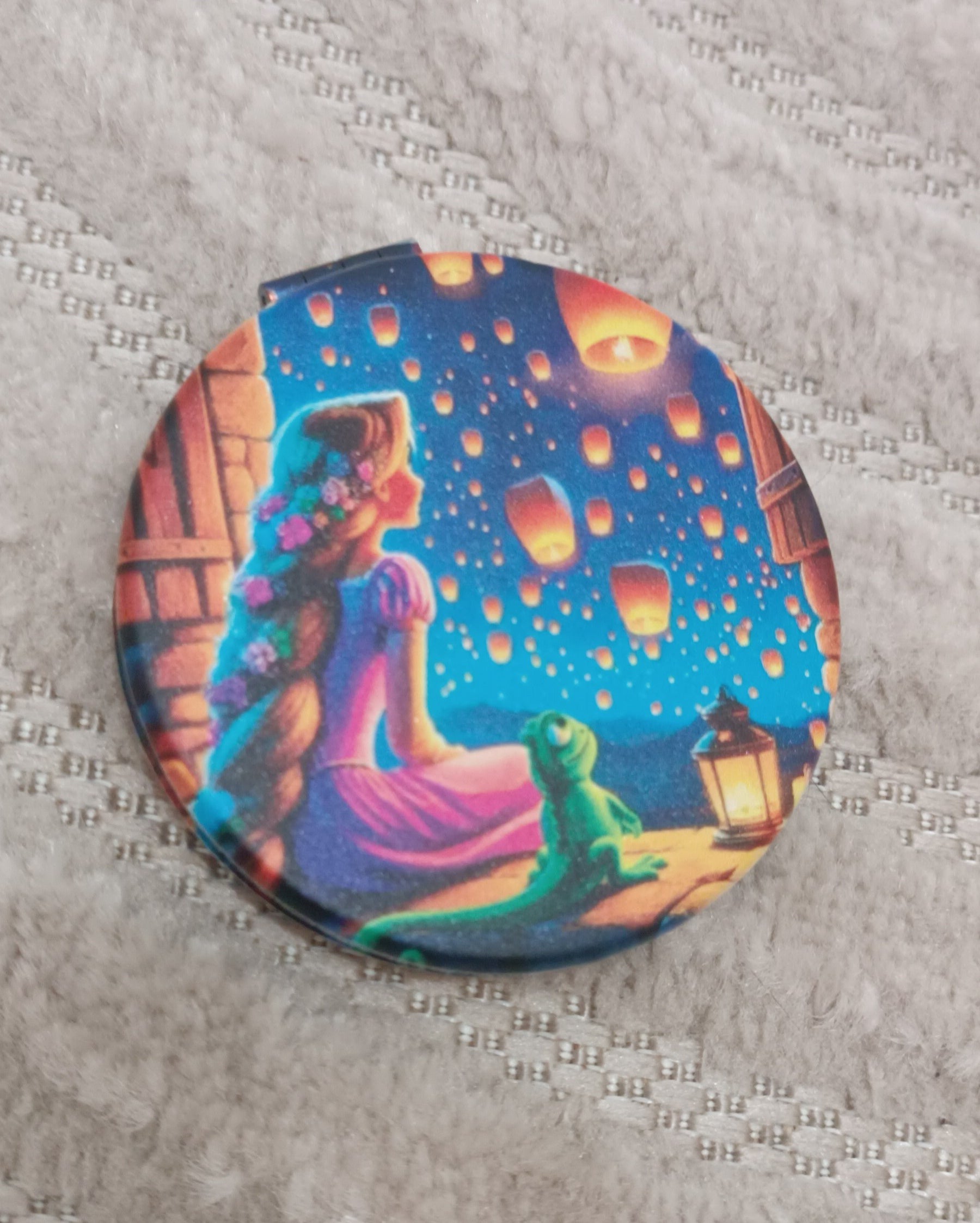 Emportez un peu de féérie partout avec vous grâce à ce miroir compact inspiré du monde lumineux de Raiponce. Sur sa face décorée, la princesse aux longues tresses contemple le ciel étoilé aux côtés de son fidèle compagnon, dans une scène poétique illuminée par des lanternes flottantes. Un accessoire à la fois pratique et enchanteur, idéal pour les rêveuses au cœur d’aventure.