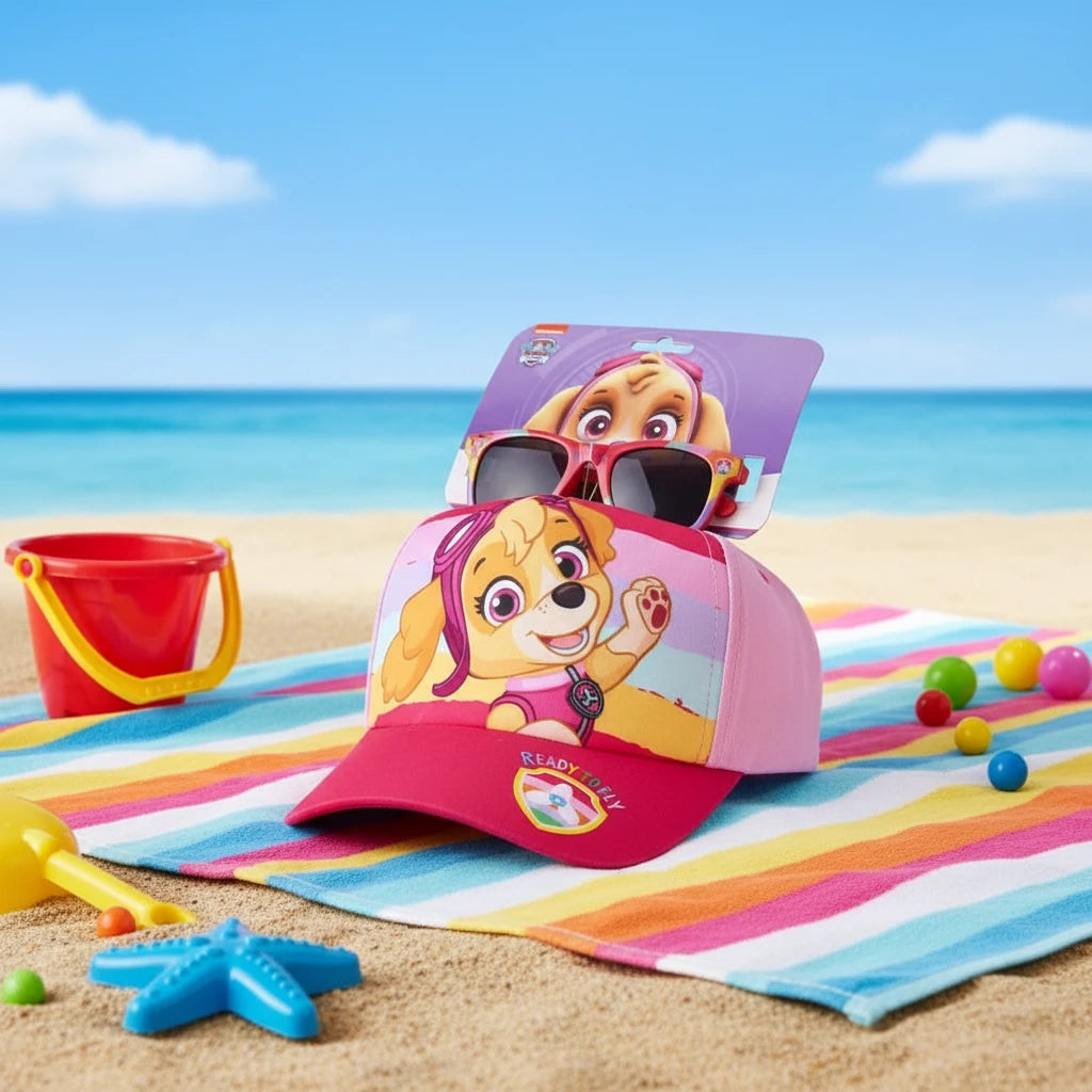 Cet ensemble réunit une paire de lunettes de soleil à protection UV totale et une casquette Pat’ Patrouille pour un look fun et protecteur.