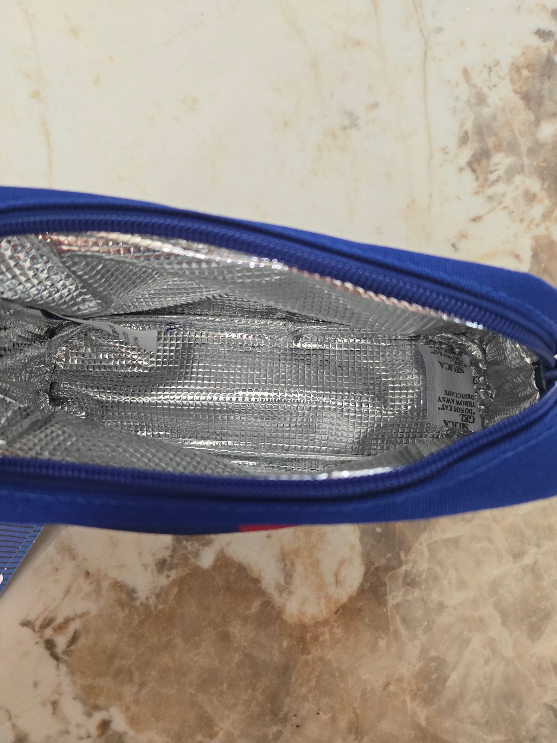Intérieur doublé d'aluminium pour conserver la chaleur et le froid. Poignée latérale. Compartiment zippé.