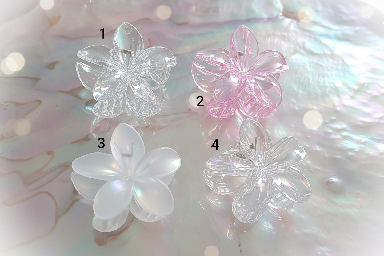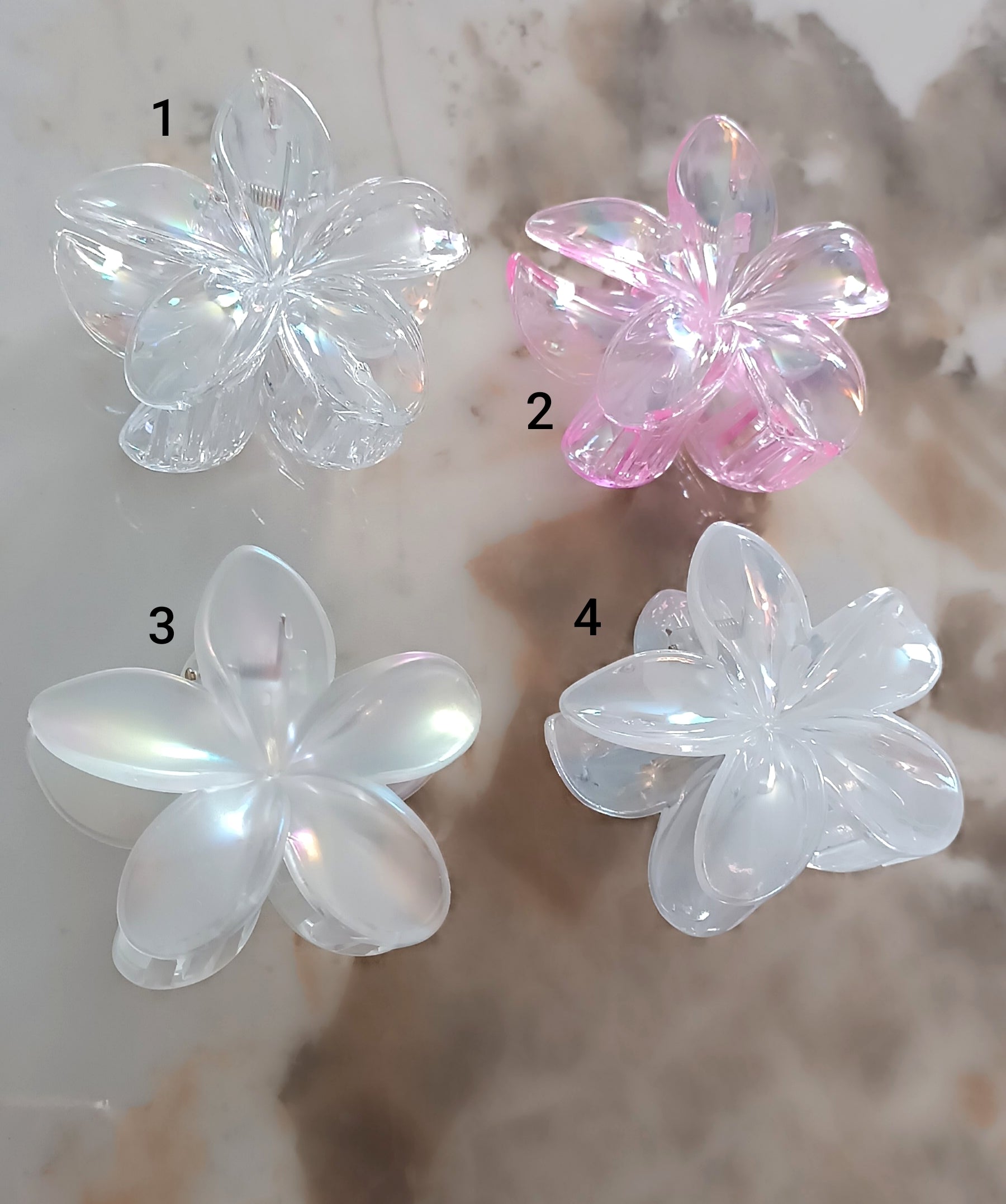 ✨ Pince à cheveux fleur irisée – Sublimez votre coiffure avec ces pinces en forme de fleur, aux reflets nacrés et transparents.