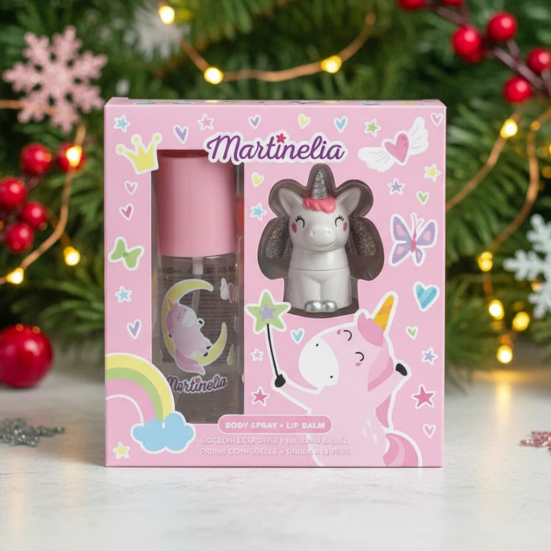 Apportez une touche de magie et de douceur à la routine beauté des enfants avec le coffret MARTINELIA Spray Corporel & Baume à Lèvres Licorne 🩷 ! Ce duo irrésistible combine un parfum corporel léger et fruité à un baume à lèvres hydratant, présenté dans un adorable packaging pastel illustré de licornes et de petits nuages.